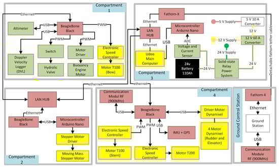 Figure 15 illustrates the block diagram and electronic components of the entire HAUG system, where the colour determines the voltage used for each component (24 V, 12 V, and 5 V). This system consists of five subsystems: four subsystems are onboard the vehicle, and one subsystem is on the ground control station on the ground. The four subsystems within the vehicle communicate via Ethernet cables, while the vehicle’s subsystem and the ground control station communicate via Ethernet cables wrapped in Kevlar strands for strength and Dacron fibres for buoyancy and space-filling. Communication between the vehicle and the ground control station uses a Fathom-X module, an interface communication module from Bluerobotics-California, USA, that changes the TCP/IP protocol to the RS-485 protocol and vice versa. This module increases communication capabilities from a maximum of 100 m on a TCP/IP-based system to a maximum of 1000 m without repeaters.