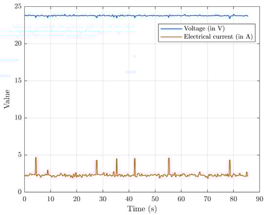 The HAUG’s electrical power usage during the hotel load operation is shown in Figure 16. In this figure, there are several spikes appearing in the graph, which indicate when the DVL sensor is being activated. From this figure, the HAUG can operate in standby mode for 47.55 h, with an average hotel load energy consumption of 55.51 watts/h with a 110 Ah 24 V battery at full charge.
