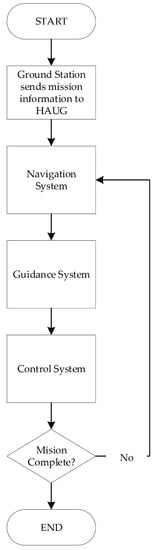 In Figure 17, the method for guiding the HAUG’s movement includes the following stages. The HAUG receives information in the form of mission area coordinate points and mission depth from ground stations via cable, radio, and/or satellite communications. The HAUG sends a signal to indicate that the vehicle has successfully received information from the ground station. Then, the HAUG retrieves its current position, attitude, speed, and depth information from the navigation system. The guidance system processes the information to determine the direction so that it can follow a guided path. To follow this guided path, the HAUG uses the line-of-sight (LOS) guidance method. The LOS guidance method uses three reference points to direct the HAUG’s movement: the point of the current position, the point of the destination position, and the point of the reference position that has been passed. The control system determines the magnitude of the action of the buoyancy engine, moving-mass engine, rudder, elevator, and thruster, according to the input from the guidance system. Then, the current HAUG’s state is updated according to the finite state machine.