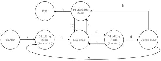 Figure 18 shows the finite state machine in every state. First, in the initial state, the HAUG is lowered into the sea. Then, if condition (a) is met, that is, the HAUG receives input from the ground station, the initial state switches to the gliding mode (descent) state. In this situation, the HAUG uses the LOS method to determine the direction of the movement to follow the guidance path, then the control system uses the proportional, integral, and derivative (PID) method, which is equipped with the gain-scheduling method and the antiwindup method to determine the angle deflection of the rudder. In addition, the control system sends a certain magnitude of action to the buoyancy engine so that the buoyancy engine pushes the fluid into the internal bladder and to the moving-mass engine to move the moveable mass to the front, so it slides down. The HAUG continues to slide down until condition (b) is met, that is, the HAUG is at a certain depth from the seabed. When condition (b) is met, the glide mode (descent) changes to the neutral state. In this state, the control system controls the buoyancy engine to release some of the fluid out to the external bladder. This action alters the HAUG, so it does not move up and does not move down. Moreover, the control system moves the moveable mass to the centre so that the HAUG has a pitch angle near zero degree. Furthermore, if condition (c) is met, that is, the HAUG’s location is outside a certain receiving radius from the destination position, then the neutral state switches to the glide mode (ascend) state. In this state, the control system sends a certain magnitude of action to the buoyancy engine (1) so that the buoyancy engine (1) releases fluid out to the external bladder and to the moving-mass engine to move the moveable mass to the rear position so that the HAUG glides up. The HAUG continues to glide up until condition (d) is met, which is when the HAUG appears on the surface of the sea. If this condition is met, the glide mode (ascent) state changes to the surface state. In this state, the control system controls the moving-mass engine to guide the HAUG to have a pitch angle near zero degree. In addition, on the surface state, the navigation system updates the current HAUG position information by using a GPS sensor. Furthermore, if condition (e) is met, that is, the HAUG’s location is outside a certain receiving radius from the destination position, then the surface state changes to a glide mode (descend) state. If condition (b) is met, the glide mode (descend) state switches back to the neutral state. In addition to the previous condition (b), condition (b) can also be fulfilled if the HAUG is at the depth of the mission and the HAUG’s position is within a certain radius of acceptance (ROA) from the destination. In the glide mode (ascent) state, condition (i) can be met, i.e., the HAUG is at the depth of the mission and the HAUG’s position is within a certain ROA from the destination. If condition (i) is met, the glide mode (ascent) changes to the neutral state. Then, if the HAUG is in a neutral state and condition (f) is met, that is, the current HAUG’s position is in a ROA from the destination, then the neutral state switches to the AUV mode state. In this AUV mode, the control system provides a value for the action of the rudder, elevator, and thrusters in manoeuvring. This AUV mode state works so that the HAUG moves towards the mission area and then carries out missions in that mission area.