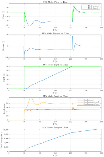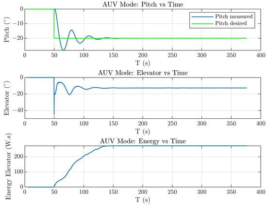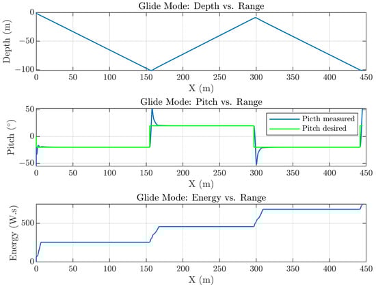 Figure 20 describes the simulation results of pitch, depth, and energy with reference to the x-earth coordinates in the glider mode. The PID values were: Kp = 0.9, Ki = 0.2, and Kd = 7 with a saturation at a ±45 elevator angle. By controlling the pitch angle, the energy efficiency regarding distance could be improved.