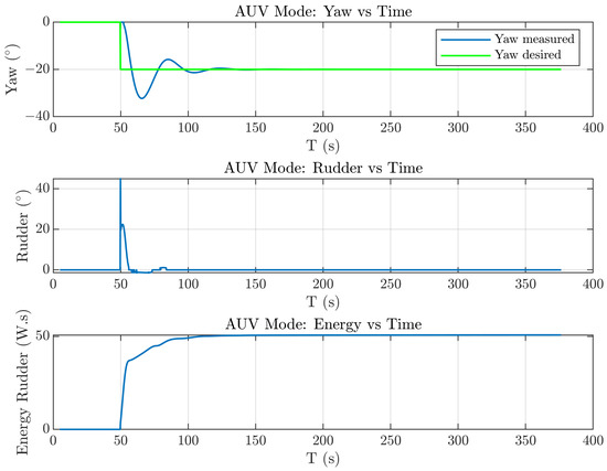 Figure 26 shows the simulation results of the depth control using the elevator. This simulation result shows that the depth control can be accomplished by controlling the elevator. At the beginning of the operation, the control system was not able to provide a good control due to the elevator’s efficient speed of operation. After achieving the operational speed of the elevator, the error value could be fixed by the control system.