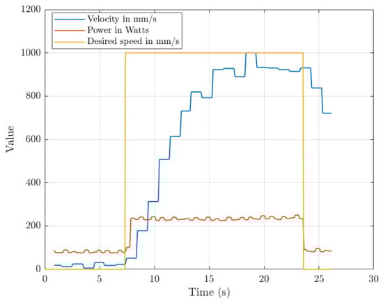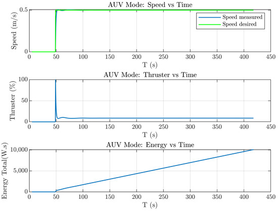 The third field experiment scenario was to use a surge control system in the AUV mode. In this scenario, due to limited space, by using the main thruster, the desired horizontal velocity was set to 1 m/s. Figure 32 shows the performance of the surge control system to track the desired speed. The maximum horizontal speed is 1 m/s and the energy consumption, while the main thruster was active, is 120.32 watts.