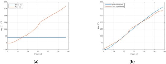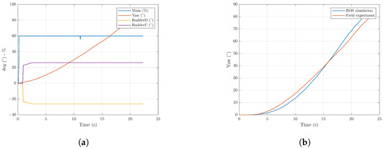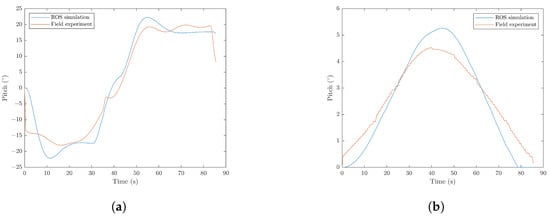 Figure 29 shows the simulation and field experiment using the finite state machine in Figure 28. Figure 29a shows the comparison in pitch measurement under the ROS simulation and field experiment, while Figure 29b shows the comparison with an in-depth measurement. The results show that the field experiment’s result was close to that of the ROS simulation.