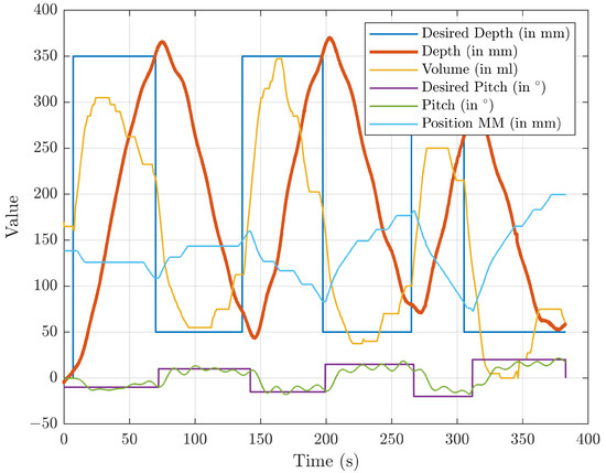 The second field experiment scenario was to use a control system to control the pitch and depth simultaneously by using a buoyancy engine and a moving-mass engine in the gliding mode. In this scenario, several pitch angles were tested, 10, 15, and 20 in three gliding cycles with target depths between 0.5 m and 3.5 m. Figure 30 shows the performance of the pitch and depth control system to track the desired pitch and depth.