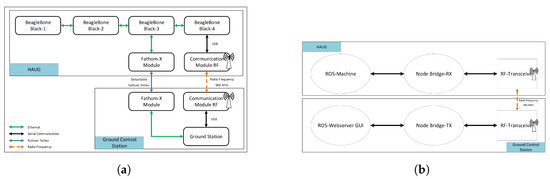 The communication system on the HAUG was designed to use a wireless system using a radiofrequency module (RF) and a wired system using a tethered module as shown in Figure 40. The block diagram in Figure 40a describes the communication system on the HAUG and the ground control station (GCS). The ROS node communication design using a wireless communication module is shown in Figure 40b.