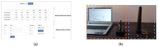 Communication system experiment. (a) Graphical user interface in the GCS; (b) Communication system experiment.