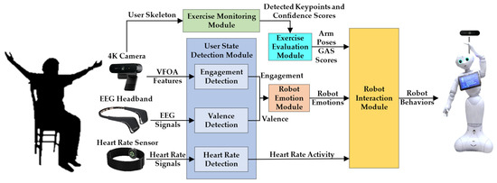 The User State Detection Module determines: (1) user valence, (2) engagement, and (3) heart rate. The quality of user experience with social robots during HRIs can be determined based on their positive or negative affect (i.e., valence) and the ability of the robot to engage users in the activity (i.e., engagement). Furthermore, to ensure users do not overexert themselves, we use heart rate to determine that it is not above the upper limit that their cardiovascular system can handle during physical activities [41].
