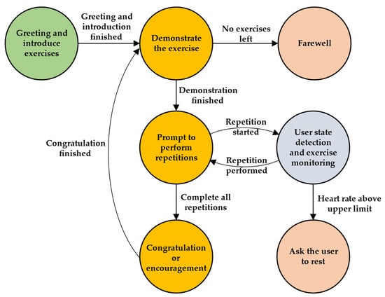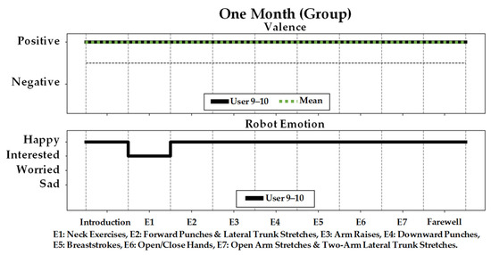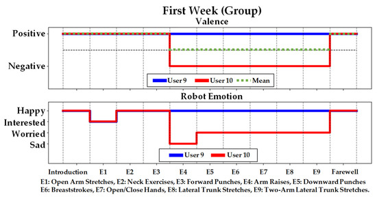 In HRI, positive and negative user valence has been correlated with liking and disliking certain HRI scenarios [57,58]. We have designed the robot’s verbal feedback to, therefore, validate its awareness of this user state, and in turn encourage the user to continue exercising to promote engagement [54,59]. Table 2 presents examples of the robot activity-specific behaviors during the exercise sessions.