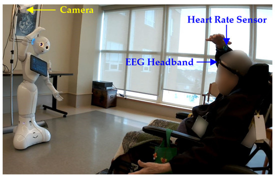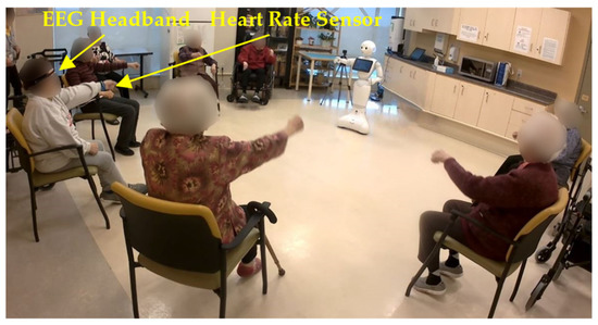 For the group sessions, participants were seated in a half circle with an approximate radius of 2 m in front of the robot in each session, Figure 4. Two random participants from each group session, who sat in the center of the half circle, wore the EEG headband and heart rate sensor for the robot to detect their valence and heart rate. This allowed for direct line-of-sight to the camera for estimating body poses during exercising; however, any two participants could wear the sensors. For the one-on-one sessions, each participant was seated 1.5 m directly in front of the robot while wearing the EEG headband and heart rate sensor, Figure 5. We used adjustable EEG headbands. The headband was adjusted in size for each participant and secured to their forehead by the research team prior to each exercise session. As the exercises did not include any fast or high-impact neck or upper body motions, movements to the band itself were minimized with no anomalies in the sensory data obtained during interactions.