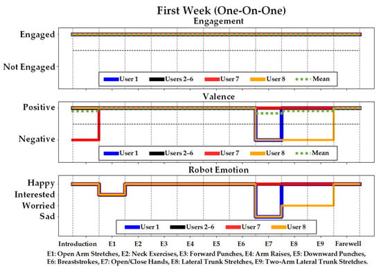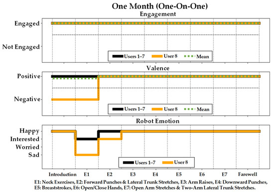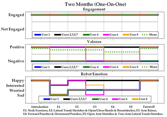 The average detected valence measured using the EEG sensor, engagement based on the users’ VFOA, and heart rate for users in the one-on-one, group, and for all participants are presented for each time period in Table 4. Participants, on average, from both one-on-one sessions and group sessions had positive valence towards the robot for 87.73% of the interaction of the time. For the group sessions, due to the large number of participants we were unable to accurately measure engagement for every participant, and therefore focus our discussions on the one-on-one sessions. All participants remained engaged towards the robot, regardless of the level of complexity of the exercises, for 98.41% of the interaction time. In addition, participants had an average heart rate of 82.37 bpm during the interactions, and none of their heart rate exceeded the upper limit of the target range (i.e., 120 bpm for 79 years old and 105 bpm for 97 years old).