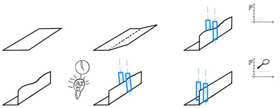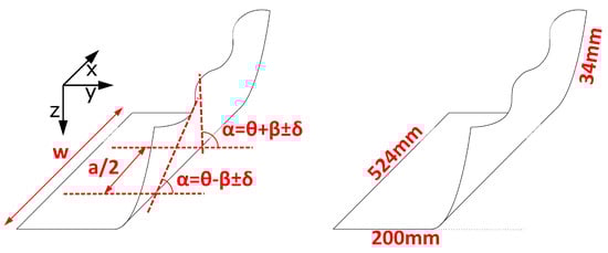 The iRoRoFo process was developed for arbitrary sheet geometries. For development purposes, however, it was initially decided to develop the solution with a simplified and well-defined geometry. A sketch of the target geometry to be incrementally formed is shown in Figure 4. The flange angle used for analysis is denoted as . The constant angle to be achieved is denoted as , and the error applied on purpose is along the bending edge with the shape of a sinusoidal wave as (wave amplitude is ). Additionally, at any location along the bending edge, an unintentional angular error may occur, e.g., due to residual stresses present in the sheet before forming. The length of the bent edge is designated as ‘w’, while the wavelength of the applied wave is ‘a’. Bending occurs around the upper roller radius, therefore locally lengthening the sheet across its cross section. The axis of the rolls is oriented perpendicularly to the bending edge.