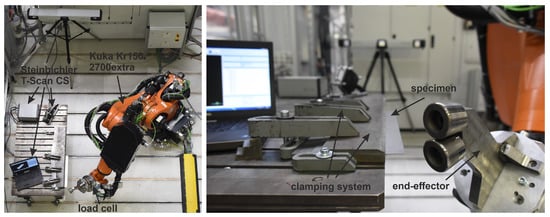 The KUKA KR150 R2700 extra [24] robot shown in Figure 2, including the software technology package KUKA.RobotSensorInterface RSI [25], was used for the trials. The package is designed for cyclical communication with the robot and enables data acquisition at the robot interpolation rate of 4 ms. In particular, using RSI instead of an independent data acquisition system for process forces for the presented application has the advantage that positions of axes and of the tool center point are registered together with the sensor data. A Schunk FT160 SI-2500-400 load cell is installed at the robot flange and connected to the sensor interface. This setup allows recording reaction forces on the end-effector in 6 axes during the forming process. Specimens are clamped between rigid steel plates in a position that allows forming and geometrical measurements.