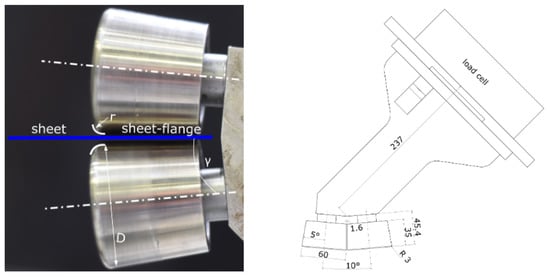 The used prototypical end-effector consists of a solid plate that allows for the fixation to the robot flange. Two conical rolls with a maximum diameter D of 60 mm are fixed with a shoulder screw with a collar (ISO 7379) each. The gap between the rolls is fixed at 1.6 mm, i.e., roll diameters have to be adapted when changing the sheet metal thickness. The two rolls are conical with an angle of = each, thus allowing for a maximum cumulative bending of when starting with flat sheets. The geometrical conditions of the rolls as implemented in the experimental setup are shown in Figure 3. The upper roll of the end-effector touched the specimen mainly in the bending corner, whereas the lower roll supported the full sheet-flange height to be bent upwards. The radius of the rolls defining the bending edge was r = 3 mm.