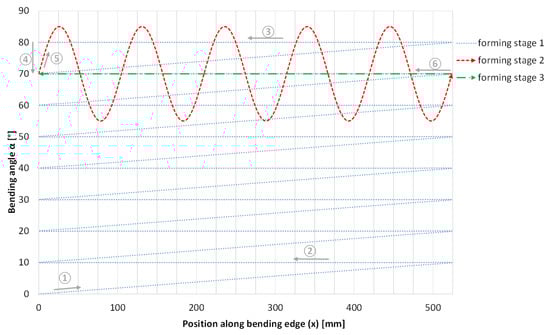 The forming process starts with a flat sheet featuring a length of 524 mm and consists of three stages, which are illustrated in Figure 5. In Forming stage 1, a constant bending angle of minus the elastic springback is incrementally created starting with a flat sheet. The angular increment corresponding to for each forming step is gradually introduced along the full bending edge length (1). The increment angle is applied to the entire sheet length on the way back (2). This procedure was repeated up to an angle of (3). In order to avoid collision with both the blank holder and the clamping system, the clamping was relocated after forming up to as described before. Elastic springback after forming up to (4) was allowed to occur as the rollers were moved entirely out of the sheet. The geometry of the sheet obtained after the final iteration of forming stage 1 was measured, and the average obtained angle was determined to be approximately , i.e., the springback amounted to . The tool angle was adjusted from to before moving back into the sheet in order to avoid a collision. In Forming stage 2, a sinusoidally wave was applied to the bent edge (5). The corresponding tool path was defined as a sinusoidal curve consisting of 5 waves with a wavelength of 104.8 mm and an amplitude of oscillating around a mean value of (i.e., the resulting angle after the first forming stage including springback). In Forming stage 3, the tool followed a straight path back to the sheet start at a constant bending angle of . The reaction forces and torques corresponding to the varying elastic response of the formed sheet during backward movement were recorded (6). These data were used later for virtual geometry measurement. Reference geometry measurements were performed, and afterward, the sheet was unclamped, achieving its final geometry after release.