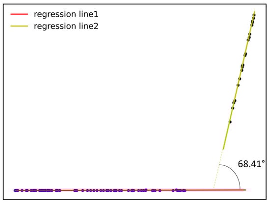 Data extraction: The flange angle along the bending edge (direction x shown in Figure 4) was determined automatically using a specifically developed algorithm. A line vertical to the edge of the sheet metal was first defined for every 10 mm of the bending edge. The points from the cloud closest to this line were chosen; thus, a section was defined for each 10 mm. This section was then projected on a plane. It can be divided into the clamped sheet region and the bent sheet. Lines were automatically fitted to these areas based on linear regression, and the angle between the regression lines was determined; see Figure 6. The automatically determined results were randomly checked along the entire bending edge by manual measurements.