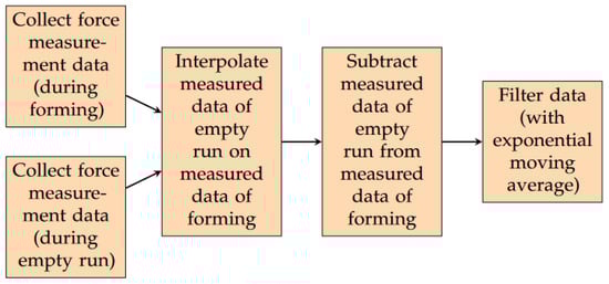 Reaction forces and torques were measured in three axes using the sensor attached to the robot flange during the forming process. Since the measured forces are influenced by various parameters that are not related to forming (such as the tool’s weight force), a concept was developed to eliminate those and focus on the reaction forces caused by the forming process itself. This concept consists of subtracting the forces acquired during an empty run, i.e., performing the same robot path without a sheet metal to be formed, from the measured forces during forming. In the last step, the preprocessed measurement data were filtered to remove noise. The process flow is shown in Figure 7.
