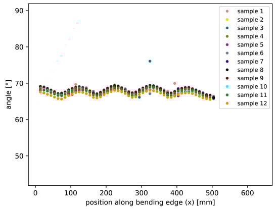Before evaluating and analyzing the data in detail, the repeatability of the performed experiments was checked. Figure 8 shows the flange angle along the bending edge for 12 samples, as this is the most relevant geometrical feature extracted from the acquired data. It proves good repeatability of the specimen shape if rarely occurring outliers that are linked to measurement artifacts are disregarded. Such artifacts may, for instance, originate from the unwanted reflection of the laser used for geometry acquisition. Instead of removing all outliers manually before proceeding, the present work aims at developing a robust method capable of handling such artifacts common also in industrial measurements.
