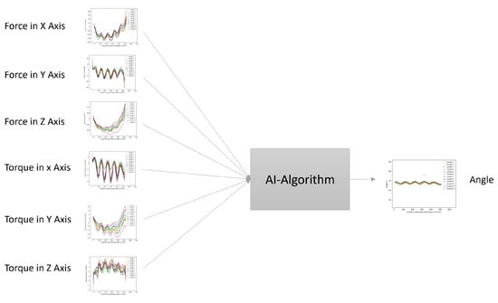 We assume that there is a correlation between the externally measured geometry and internally measured force. However, there is no direct and easily recognizable rule for this correlation. For this reason, AI algorithms were used for data analysis. When selecting inputs and outputs for AI algorithms, it is desired that there is a relationship between inputs and outputs. However, the same is not valid without restriction for different input data. For checking possible relationships between different input data, the correlation between them was analyzed by calculating the Pearson correlation coefficient, which is a linear correlation coefficient for measuring the association between two variables [29]. The input data consist of forces and torques in the x, y and z directions along the bending edge. The highest correlation was found between the force on the y-axis and torque on the x-axis, with a value of 0.93. Force in the z-axis also correlates highly with force in the x-axis and torque in the y-axis. The mentioned correlations have values equal to 0.89 and 0.82. The Pearson factor was also calculated between input and output data, but no significant values could be detected. This was expected since there is no visible linear relationship between input and output. Since there is no clear understanding of whether and which parameter should be eliminated from the input data set to achieve even better results with machine learning (ML) algorithms, the complete data were used in the present work. Further research could be performed in this context, exemplarily by bivariant feature analysis and also with the help of principal component analysis.