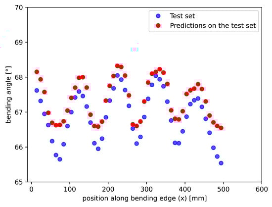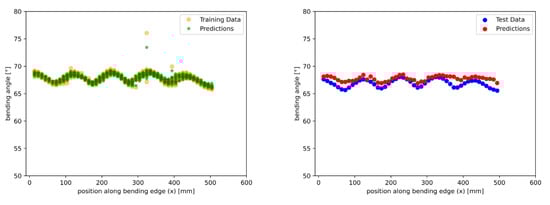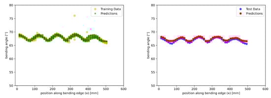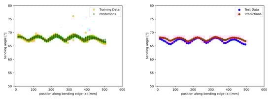 After 1000 runs, the best-proposed model is a neural network with 4 hidden layers trained in 262 epochs with a batch size equal to 9. To compare the results with the other models, the flange angle along the bending edge was plotted for measured and predicted data; see Figure 16. When looking at the training data (left plot), it can be seen that outliers are not learned, but the predictions for x-values in the range of 400 mm and higher contain higher errors. On the right plot, the test data show that the pattern was predicted much better compared to the other proposed models. Especially at the beginning and end of the sheet, the curve direction could be predicted better, and in the middle of the sheet, there is a lower error. This is confirmed by a MSE value of 0.22 and a mean absolute error (MAE) of .