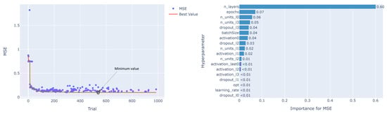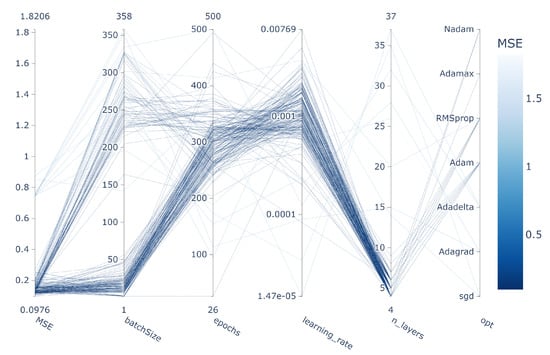 It can be seen that small values of MSE can be achieved with smaller batch sizes (1–70) as well as larger ones (200–300). However, best values are achieved with a batch size smaller than 70, which also causes longer training times. Epoch numbers between 200 and 400 and a learning rate between 0.0005 and 0.007 also have an impact on better results. A small number of layers between 4 and 10 has shown a positive influence. Most of the good results were achieved using RMSprop as an optimizer.