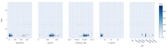 The following analyses investigated the influence of batch size, epochs, number of layers, and learning rate on MSE. The achieved MSE as a function of hyperparameter values in each sample is first shown in Figure 14. On the x-axis, the values of each hyperparameter and on the y-axis, the achieved MSE are shown, and the different blue tones of the points are supposed to indicate different samples. Since in this diagram, for each sample, only the single hyperparameter is shown and the values of other hyperparameters in the sample are not visible, in Figure 15, the selected combination of them in each sample is shown in a single view. So, in the first diagram, the more exact values and the development in each experiment can be analyzed. In the second diagram, the influence in combination with other hyperparameters can be shown together.