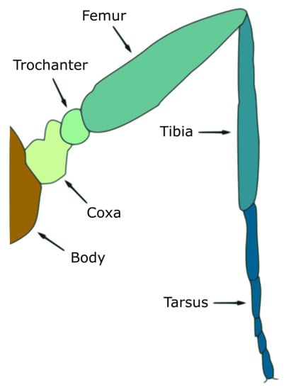 - Beeson, N.W. File:InsectLeg.png. 2010. Available online: https://commons.wikimedia.org/wiki/File:InsectLeg.png (accessed on 29 January 2023).