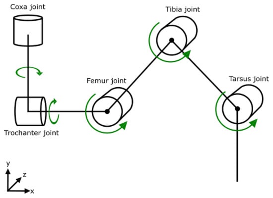 The design of the leg is inspired by insect leg structure so the robot can mimic insect movement patterns. The insect leg consists of five main parts—coxa, trochanter, femur, tibia and tarsus []. The insect leg structure is shown in Figure 1. The coxa part is usually less than 10% of the total leg length and is free to rotate with three degrees of freedom within definite limits. The trochanter is even smaller, in the range of 2–8% of the total leg length []. Femur and tibia are usually the same size or femur is longer than tibia []. Tarsus consists of 3 to 7 segments and its length can vary. The position of each joint depends on the leg position. Front legs have typically different joint positions and link sizes compared to middle or hind legs [].
