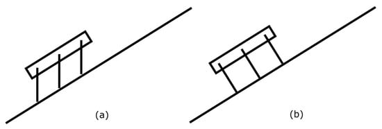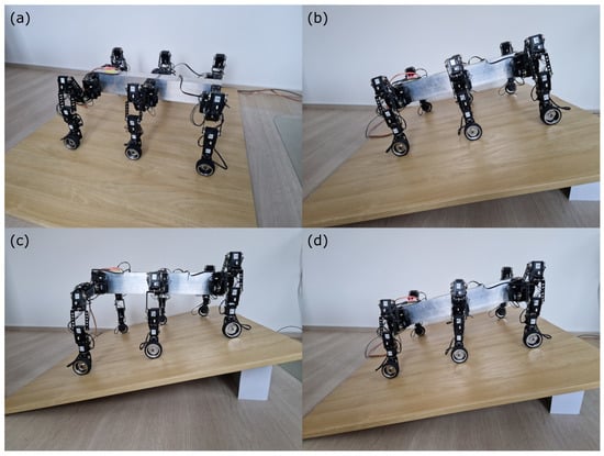 Three different static stances and two movements (tripod gait with a maximum speed of 0.12 m/s and a period of 1.6 s and ride using six wheels with a maximum speed of 0.2 m/s) were tested at six different inclinations (see Table 4). All tested stances were based on the robot’s default stance (Figure 7a). The first derived stance (No. 1) did not use the trochanter joint and all limbs were at the same height (Figure 7b). The second derived stance (No. 2) also did not use the trochanter joint, but the individual limbs were at different heights that corresponded to the slope of the tested terrain (Figure 7c). Finally, the third derived stance (No. 3) used the trochanter joint and all limbs were at the same height. The angle of rotation of the trochanter joint was identical to the slope of the tested terrain (Figure 7d).