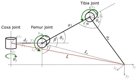 The forward kinematics of the leg is based on the Denavit–Hartenberg (DH) convention (the Denavit–Hartenberg leg parameters are shown in Table 3). The transformation matrix DH between the coordinate systems of adjacent legs is given by Equation (1):