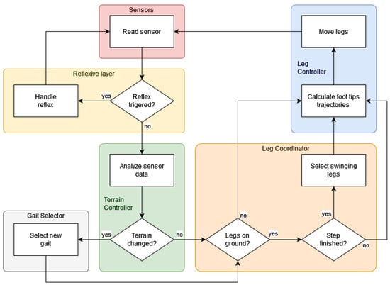 The movement controller adapts the used gait to the current terrain conditions. It consists of five main blocks—reflexive layer, terrain controller, gait selector, leg coordinator and leg controllers (see Figure 6). The controller was described in detail in previous work [].