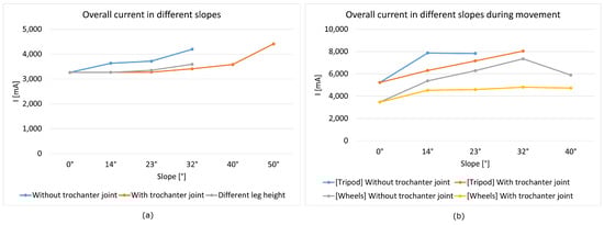 Overall current on different slopes for static stances and movements. (a) Static stances: The graph shows that the stance using the trochanter joint and the stance with different leg heights had almost the same energy requirements. In contrast, the basic stance required more and more energy as the terrain slope increased. (b) Tripod and wheel mode: The movement with the usage of the trochanter joint had a lower power consumption in all measured inclinations. The use of a trochanter joint also reduced the power consumption when using wheels.