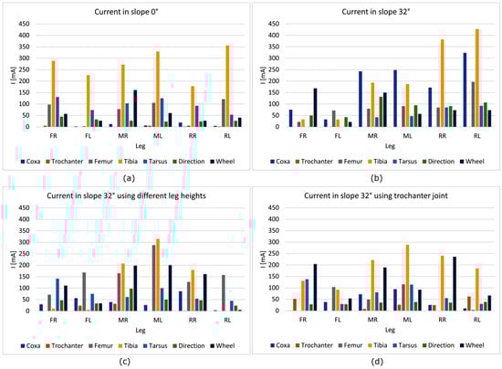 The results are presented in more detail in the graphs, which show the current of individual servomotors of each leg on 0° and 32° terrain slopes for three static stances (see Charts a–d in Figure 9). It can be seen that, as the slope of the terrain increased, the robot’s centre of gravity shifted backwards, increasing the load on the rear limbs. In contrast, the front limbs were loaded significantly less. Furthermore, the coxa servomotors were significantly more loaded when standing without a trochanter joint at a 32° inclination.