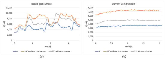 The charts in Figure 10 show the current of the robot when moving using tripod gait and wheeled locomotion with, and without, the use of the trochanter joint on flat terrain and on a 23° slope. The speed of the tripod gait ranged from 0.07 m/s to 0.12 m/s and its period was 1.6 s. The tripod gait on flat terrain had the lowest energy consumption and regular swing phase of the limbs. When walking on sloping terrain, small slips occasionally occurred, especially when using the stance without the trochanter joint.
