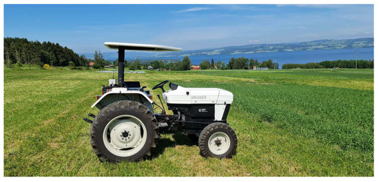 The mobile robot (referred to as “robot” in the remainder of the paper) is a differential drive vehicle (Figure 3) with a payload of maximum 750 kg. It is equipped with a three-point mount system similar to the one used by conventional tractors, which opens for a multi-purpose utilization. Eight (8) 12 V batteries power the robot. We redesigned the robot to meet our requirements. The driving wheels and their gearbox have were upgraded, and all the electronic parts were remade. The robot was run on ROS (Noetic) and equipped with the same RTK-GNSS receiver as in the one found on the tractor.