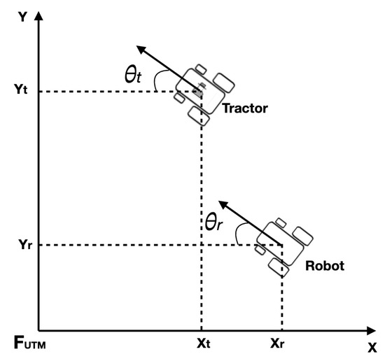 where and represent the UTM coordinates of the reference point of the tractor, while and are the UTM coordinates of the robot. and represent the heading of the tractor and the robot in the reference frame, respectively .