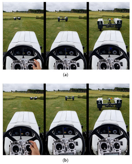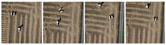 Once we ensured that the robot showed acceptable behavior when navigating towards the fixed location of the tractor, we moved to the second phase. We performed field driving, where the tractor’s pose is no longer static, but dynamic. To this end, the tractor was driven manually throughout the field while broadcasting its position continuously to the robot. The robot, taking the tractor’s pose as a target, used the control law established in Equation (3) to reduce both the distance and the angle and fulfill the predefined configuration (driving to the right of the tractor at a distance of 7 m). Figure 9 illustrates a sequence where the tractor and robot performs a U turn while driving inside the field.