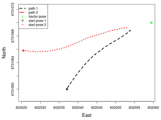 The robot used the pose of the tractor as the following goal, and tried to reduce the pose errors (Equation (2)) to the predefined values. The gains were then tuned to reduce the undesired behavior of the robot while driving and reduce the converging time to the desired pose (tractor location). The trajectory of the robot during these trials (starting positions 1 and 2) can be seen in Figure 7.