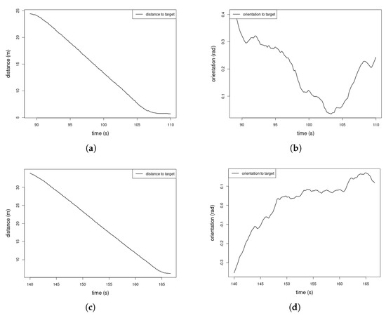 The evolution over time of both the distance and orientation separating the robot from the tractor during the static waypoint experiments. The robot stopped at 6.2 m and 5.7 m, respectively, when beginning its navigation from the two starting positions. (a) Distance: start pose 1. (b) Orientation: start pose 1. (c) Distance: start pose 2. (d) Orientation: start pose 2.