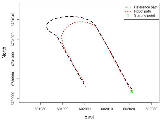 As the tractor directly sent the coordinates of the reference point (and not its own coordinates), the robot only had access to reference point coordinates and not the actual coordinates of the tractor. Since we only recorded the data from the robot, we only had the reference path (the evolution of the reference point during the navigation) and not the actual path of the tractor. Figure 10 shows the path of the robot and its reference path while navigating inside the field.