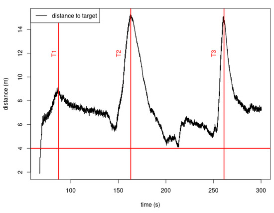 During field navigation, the tractor was driven without using cruise control for constant speed, and the navigation trajectory was chosen to emulate driving back and forth with U-turns in between. Figure 11 and Figure 12 show, at T1 = 87 s, T2 = 163 s, and T3 = 261 s, spikes in the distance that separates the robot from the tractor. These occurred when the tractor driver performed a u-turn (the spikes are the turning point at which the tractor’s driver is already performing the other half of the u-turn). Since the robot, at the time of writing this paper, has no special instructions when it comes to performing u-turns, the distance that separates it from the tractor increases because of the upper-velocity limit that imposed on the motors’ speed controllers for security reasons. At the end of the previously mentioned time spikes (t1, t2, t3), we can see that the distance converges again, which means that the robot is caught up with tractor, and followed it according to the predefined scheme.