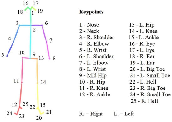 OpenPose uses the entire image as input to a convolutional neutral network (CNN) to predict 2D confidence maps and detect body parts []. Figure 1 illustrates the OpenPose keypoints of the human body skeleton.