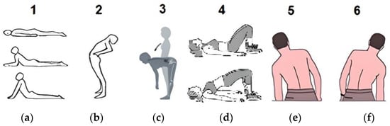 Physical therapy exercises used in the games. (a) lumbar extension in the lying position; (b) lumbar extension in the upright position; (c) lumbar flexion in the upright position; (d) hip extension; (e) left lateral flexion; (f) right lateral flexion.