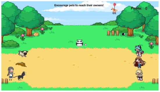 Figure 5 shows the three animals that must be encouraged to reach their respective owners. The left part of the park illustrates the dog, the rabbit, and the cat, which must reach their owners in the respective order on the right part of the park. At the top center, a sentence explains what the player must do, working as a game tutorial. The right part shows the scoreboard for the game. The other animals in the scene intend to immerse the user even further in the context of the park, with some even having a comic nature to entertain the patient.