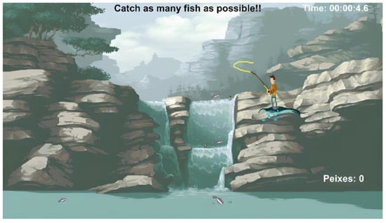 Figure 7 shows the default screen for the fishing game, illustrating the characters controllable by the player via OpenPose and the camera, which are a fisherman and his elevator platform, a flying manta ray, in a fishing scenario represented by a landscape with waterfalls, a river, trees in the background, and fish jumping in the water.