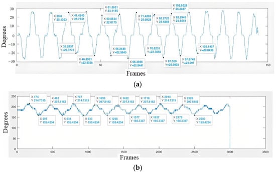 Figure 11a illustrates the graphs obtained from OpenPose for the infinite run game, and Figure 11b shows the data obtained with the Miotec goniometer.