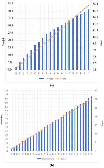 (a) Graph of the position over time, associated with the score obtained, A-Lying, B-Stage 1 lumbar extension, and C-Stage 2 lumbar extension in the asteroids game. (b) Graph of position and the distance traveled, as associated with the score achieved, A-Left lateral flexion, B-Center, and C-Right lateral flexion in the infinite run game.