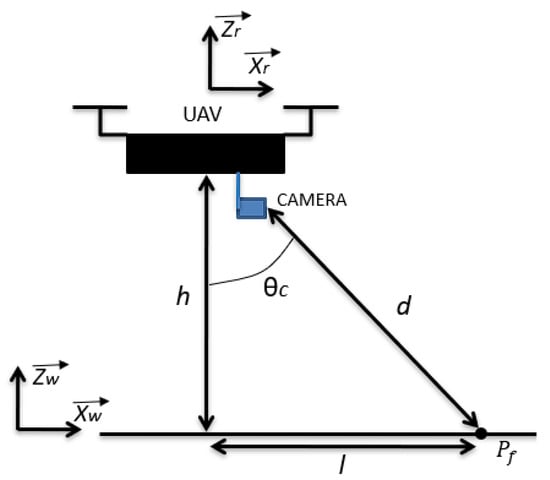 The methodology proposed in this paper is in the Image-Based Visual Servo (IBVS) control category, which relies on visual information extracted in the image plane, providing the control actions to be applied. In other words, the detected straight lines in a frame serve as a parameter for the determination of the drone’s position in relation to the power lines and, thus, the strategy adopted for trajectory tracking involves keeping the detected lines in the center of the image with their orientation perpendicular to the lower portion of the frame. Figure 1 and Figure 2 display the lateral and superior views of the proposed problem, respectively. is the point of the path used to compute Z, h is the height of the UAV relative to the power lines, is the tilt between the camera and the vertical axis of the UAV, l and d are the distances between the projection of the UAV on the transmission lines plane and the position of the camera to point , respectively. The vectors , , and are related to the world frame W, while , , and are related to the UAV frame R. is the vector parallel to the lines, while is a vector perpendicular to . is the UAV’s orientation in relation to W. Table 1 presents the nomenclature used in this paper.