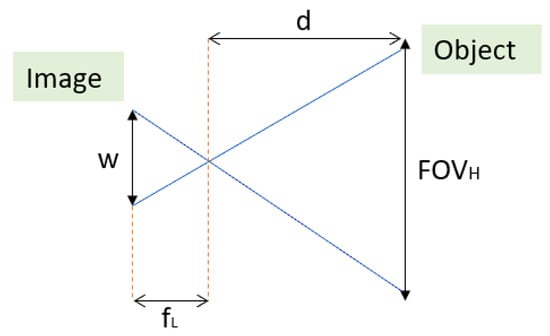 where is the focal length of the camera, is the camera horizontal field of view, and w is the object width in the image. It is assumed that the height h is known during the tests and that all transmission lines are within the camera’s field of view, which must be pointed downwards.