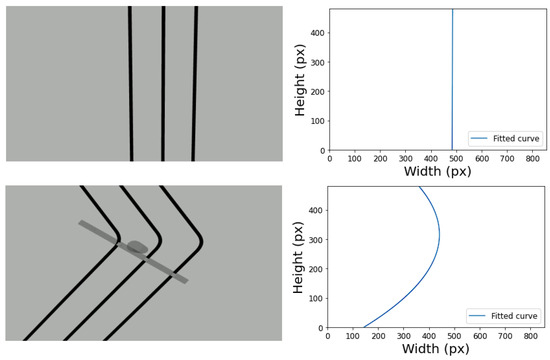Although the path is often rectilinear, a second-order curve was used to model the trajectory. The reason for this approach is that regions between two transmission poles can result in an abrupt change in the path orientation. Considering the path as a curve smooths these transitions, allowing navigation without significant oscillations. Figure 5 exemplifies the trajectory estimation processes in two scenarios simulated with the Gazebo simulator.